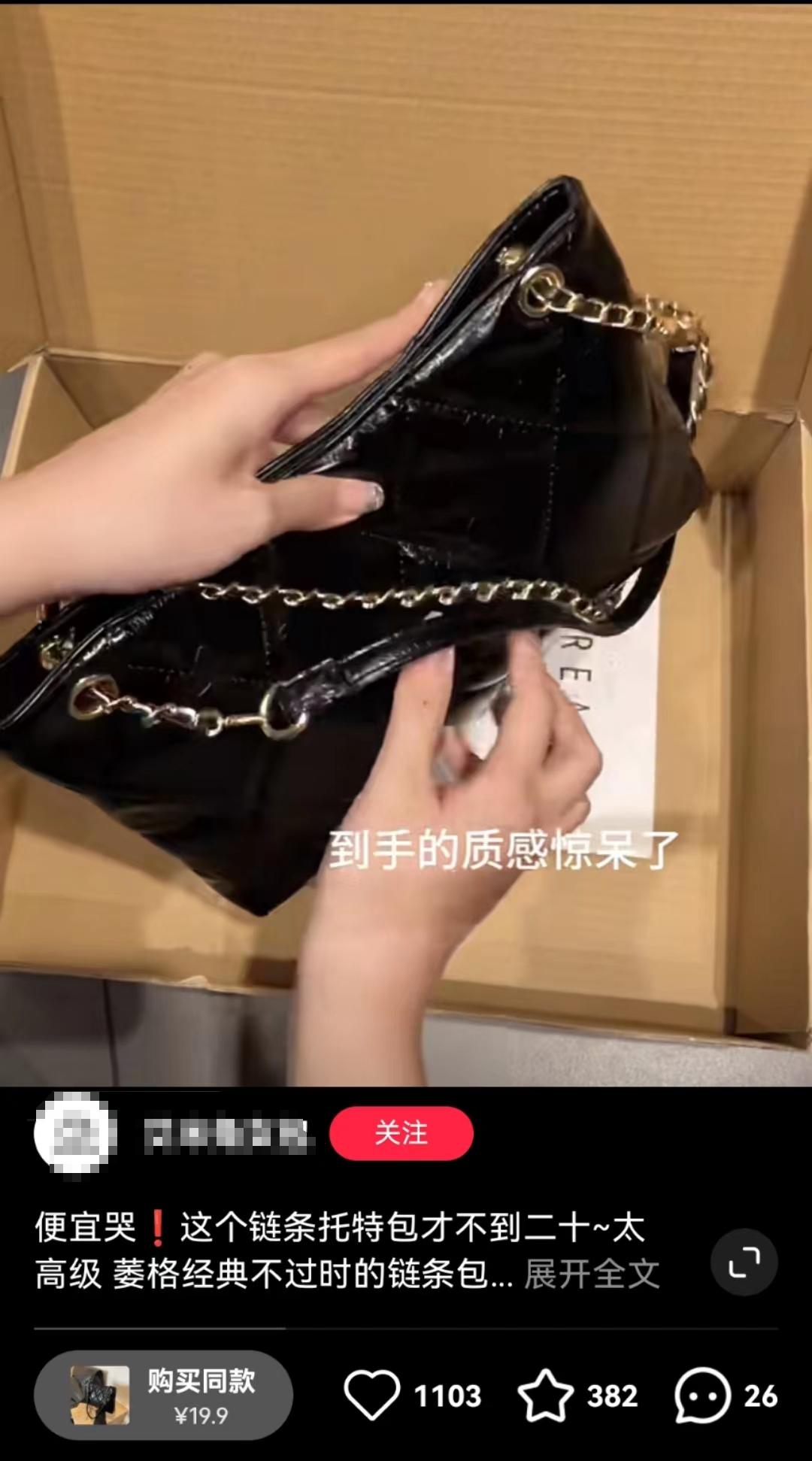 在一条为一只19.9元的包包带货的笔记中,包包被放在了昏黄的灯光下,画面的下方伸出一只贴有轻奢风美甲的手,对这只包包左摸右摸,又敲了两下以显示质感,再配上舒缓的BGM和闪光的滤镜,颇有点卖199元时店家宣传的样子。