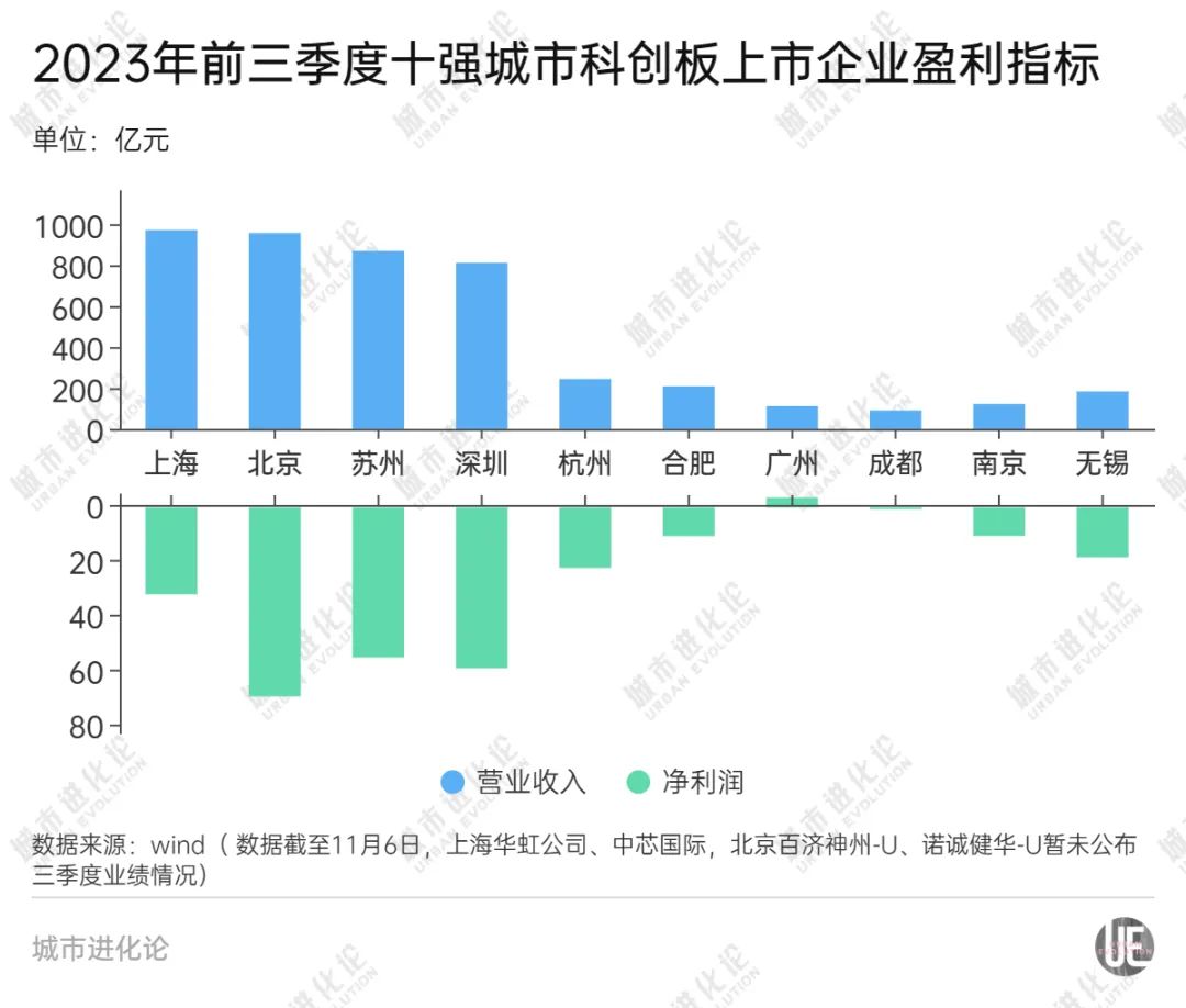 Wind数据显示,城市科创板上市企业营收规模与企业数量分布基本一致,上海、北京、苏州、深圳高居全国前四,今年前三季度营收均在800亿元以上,占据较大市场份额。杭州、合肥营收在200亿元以上,无锡、南京、广州营收在100亿元以上,同样表现较为亮眼。