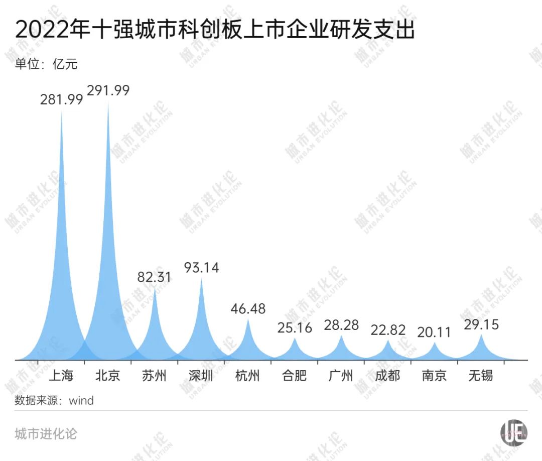 Wind数据还显示,2022年北京、上海科创板企业研发支出均已接近300亿元,而深圳、苏州都在80亿元以上,杭州、无锡、广州、合肥、成都、南京亦超过20亿元。在加快构建以企业为主体的创新体系过程中,科创板上市企业的引领作用已经十分明显。