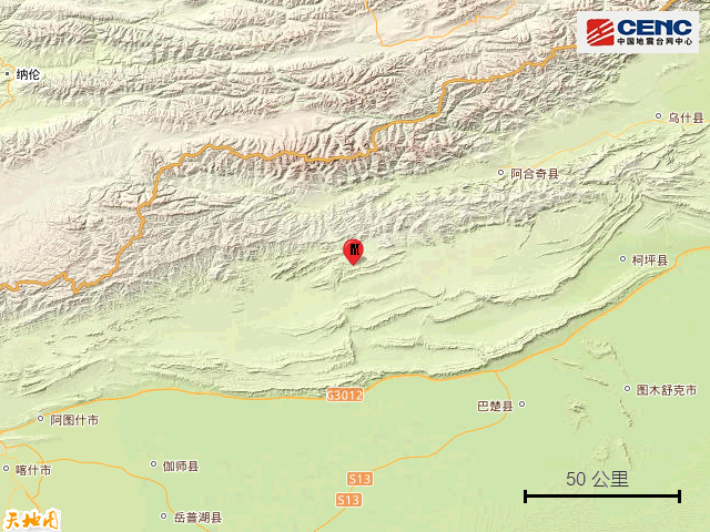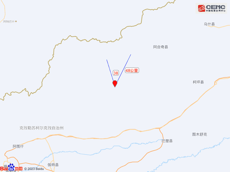 8日2时9分在新疆克孜勒苏州阿图什市发生5.4级地震,震源深度10公里,震中位于北纬40.47度,东经77.72度。