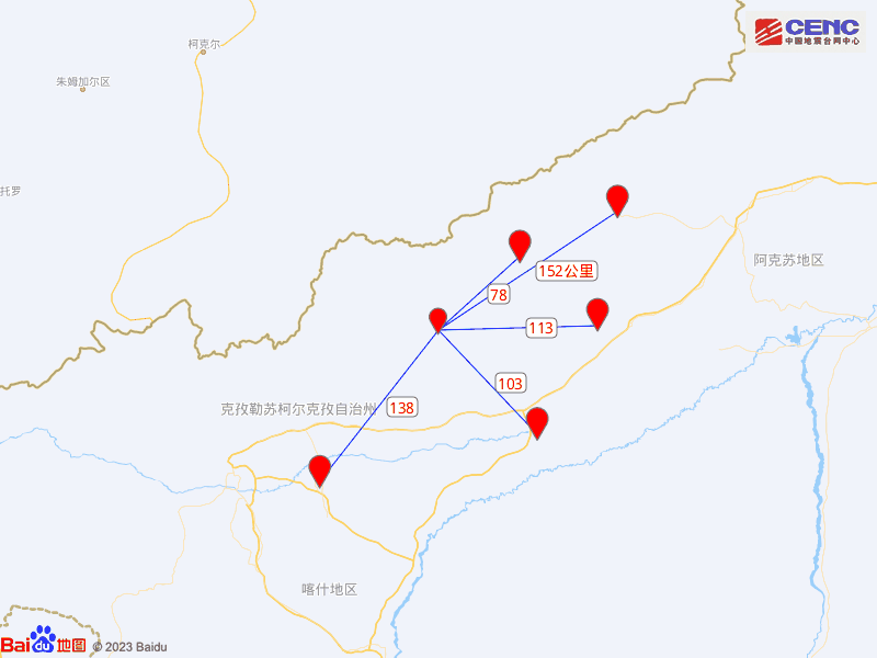 11月8日凌晨,新疆克孜勒苏州连续发生6次地震,最小震级3.2级,最大震级5.4级。