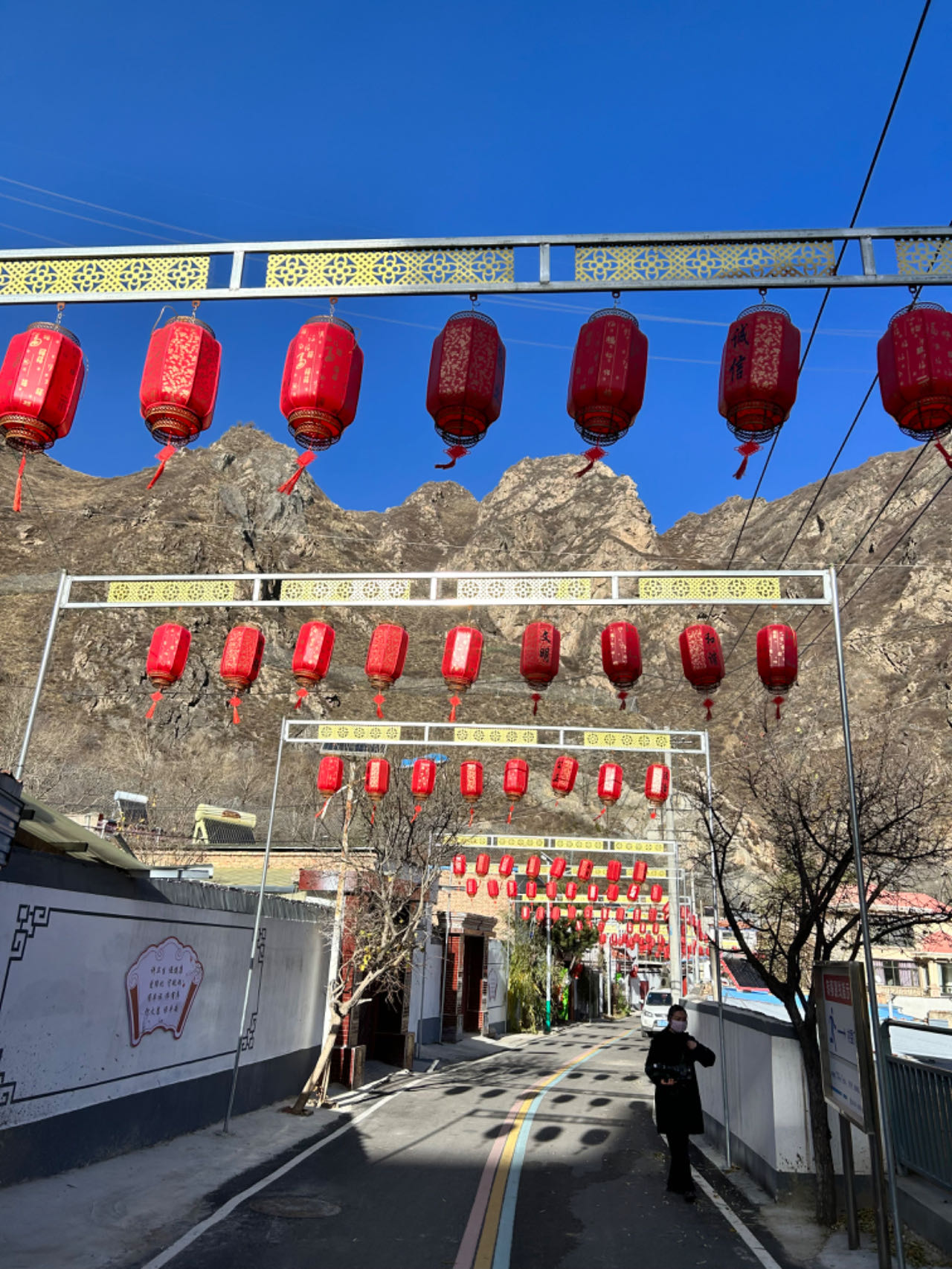 村里的主干道上方挂满了一排排红色的灯笼,在蓝天下分外美丽。湟源县委宣传部副部长车晓琴告诉澎湃新闻记者,这些灯笼是李桂娟亲自挑选的,一开始她到湟源县城里去买,没找到心仪的款式;接着她到西宁市里去买,又觉得价格有些高;最后,她在网上挑来挑去,终于找到款式漂亮、质量好、价格低的灯笼。