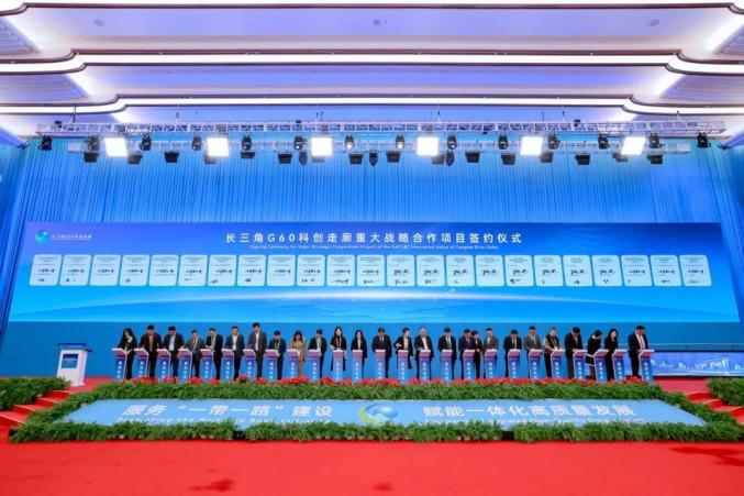 G60科创走廊九城市“一网通办”综合服务窗口。合肥日报全媒体记者 张大岗 摄会上,一批重大科技成果和要素落地发布,一批重大项目集中签约,一批G60跨区域合作示范载体集中授牌,举行了“中老班列—G60号”首发仪式,成立了中阿G60合作发展促进中心、上合示范区G60创新协同中心、长三角G60科创走廊量子密码应用创新联盟(中心),举办了第二届“创赢未来”G60科技与产业创新大赛颁奖仪式。