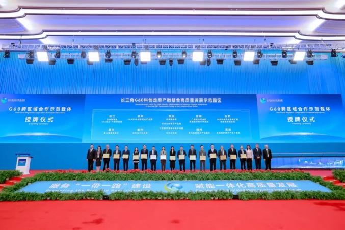 会上,一批G60跨区域合作示范载体集中授牌。(图源:长三角G60科创走廊)原标题:《发展动能靠科创,发展实力靠产业,发展生态靠担当!虞爱华出席G60科创走廊高质量发展要素对接大会并致辞》