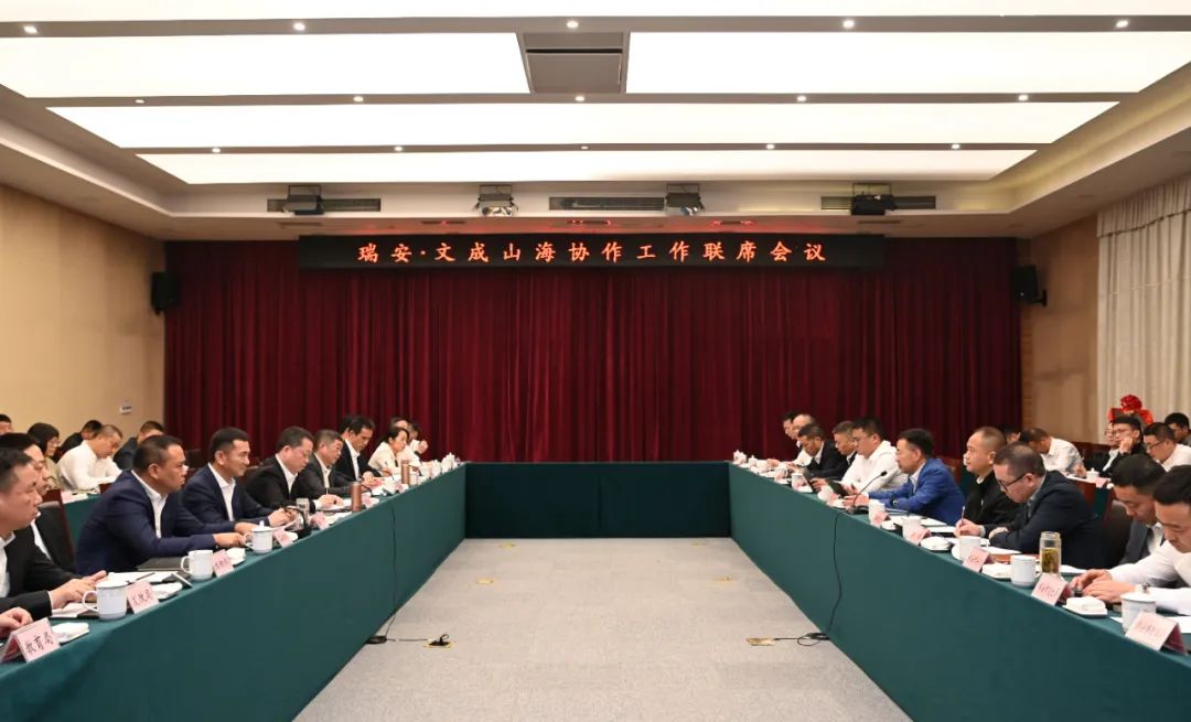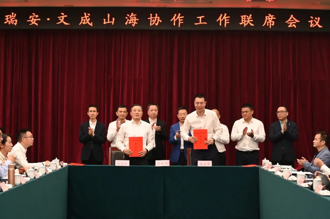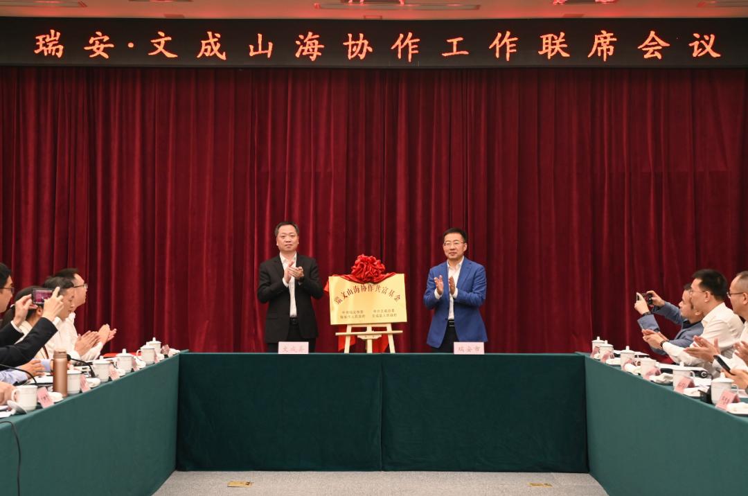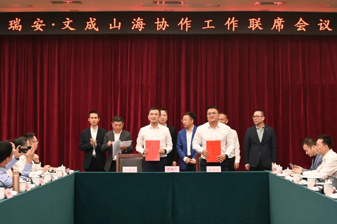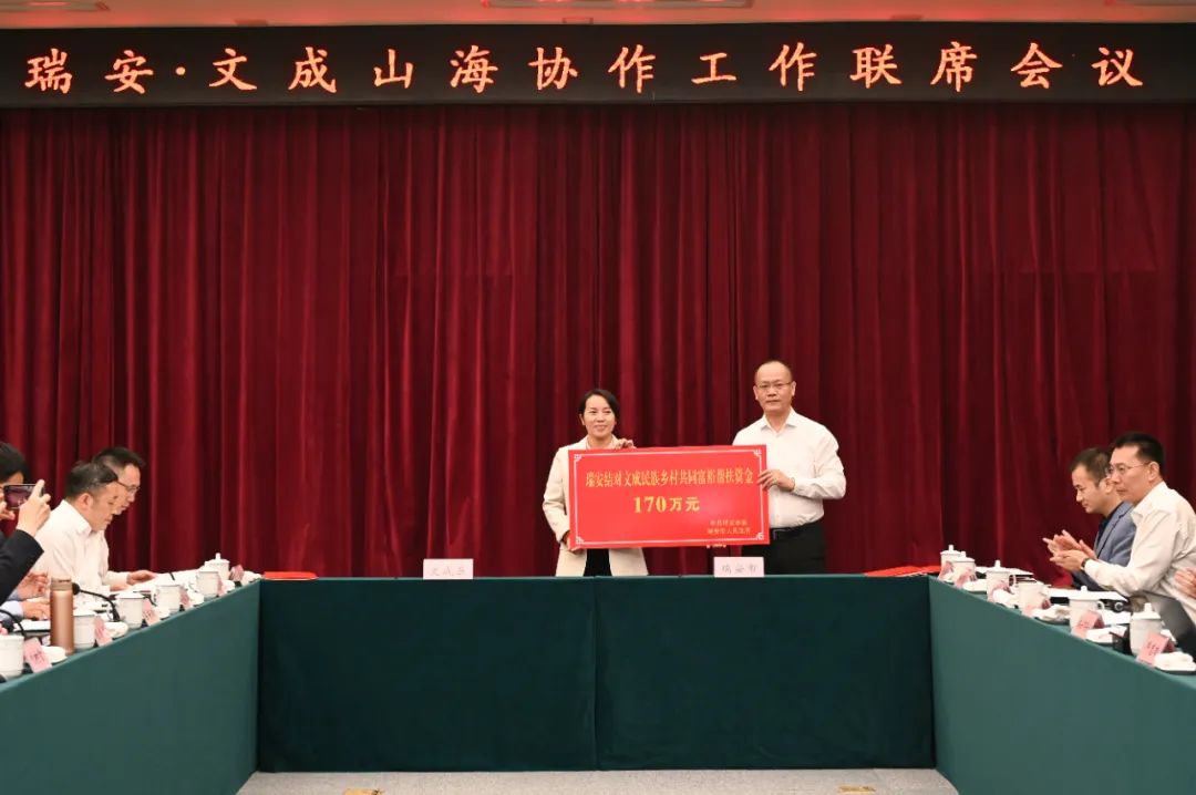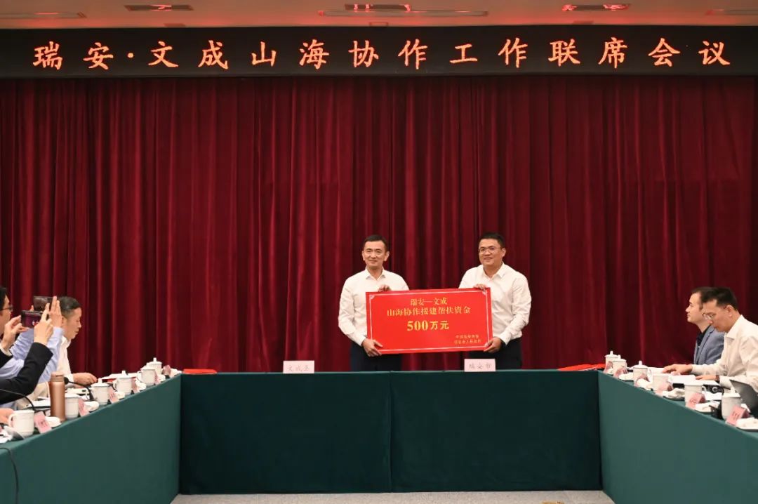 会上,瑞安与文成签订了战略合作、年度合作、“产业飞地”合作共建、产业链合作共建以及联动招商合作协议书,举行了援建帮扶资金、结对民族乡村共同富裕帮扶资金捐赠仪式以及共富基金揭牌仪式。会议还听取了山海协作工程开展情况、民族乡村共同富裕工作情况等介绍。