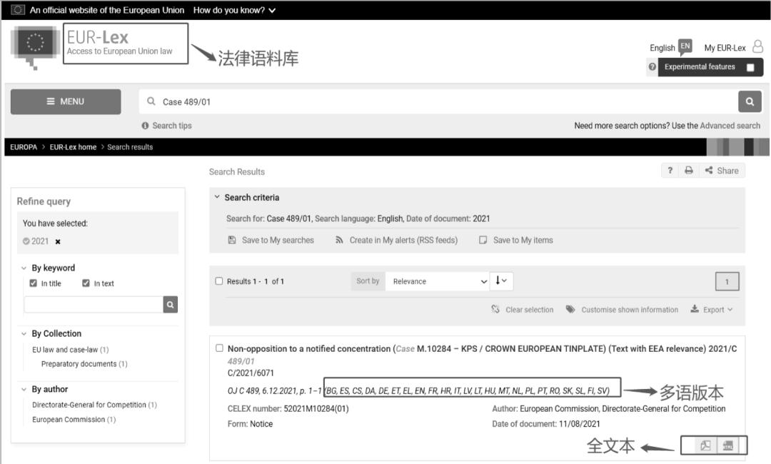 图1为欧盟法律语料库检索界面,以案例“Case489/01”为关键词进行检索,得到23种欧盟语种的案例详情,提供了全文本(pdf及html)浏览及下载。可见,欧盟建设的多种法律语料库收集了大量来自不同语言和法律体系的文本样本,并通过系统性的整理和标注,形成了一个涵盖多种语言和法律领域的数据资源库。这为欧洲法院提供了丰富的语言素材,以支持案件处理过程中的文义解释工作。无论是解释法律文本中的特定术语,还是理解不同法律体系之间的差异,这些语料库都能提供有力的证据支持和参考。