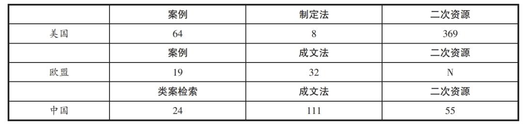 语料库中大量文本数据的集合既为大数据分析提供了丰富的资源,又可以用来训练人工智能模型以提升语言理解能力。大数据为人工智能提供了基础,通过使用海量数据进行模型的训练和优化,可以实现更加准确和智能的分析和决策能力。以中英文“语料库”作为关键词分别在Lexis、ERO-Lex语料库及北大法宝中进行检索可以得到下表的基本数据分布: