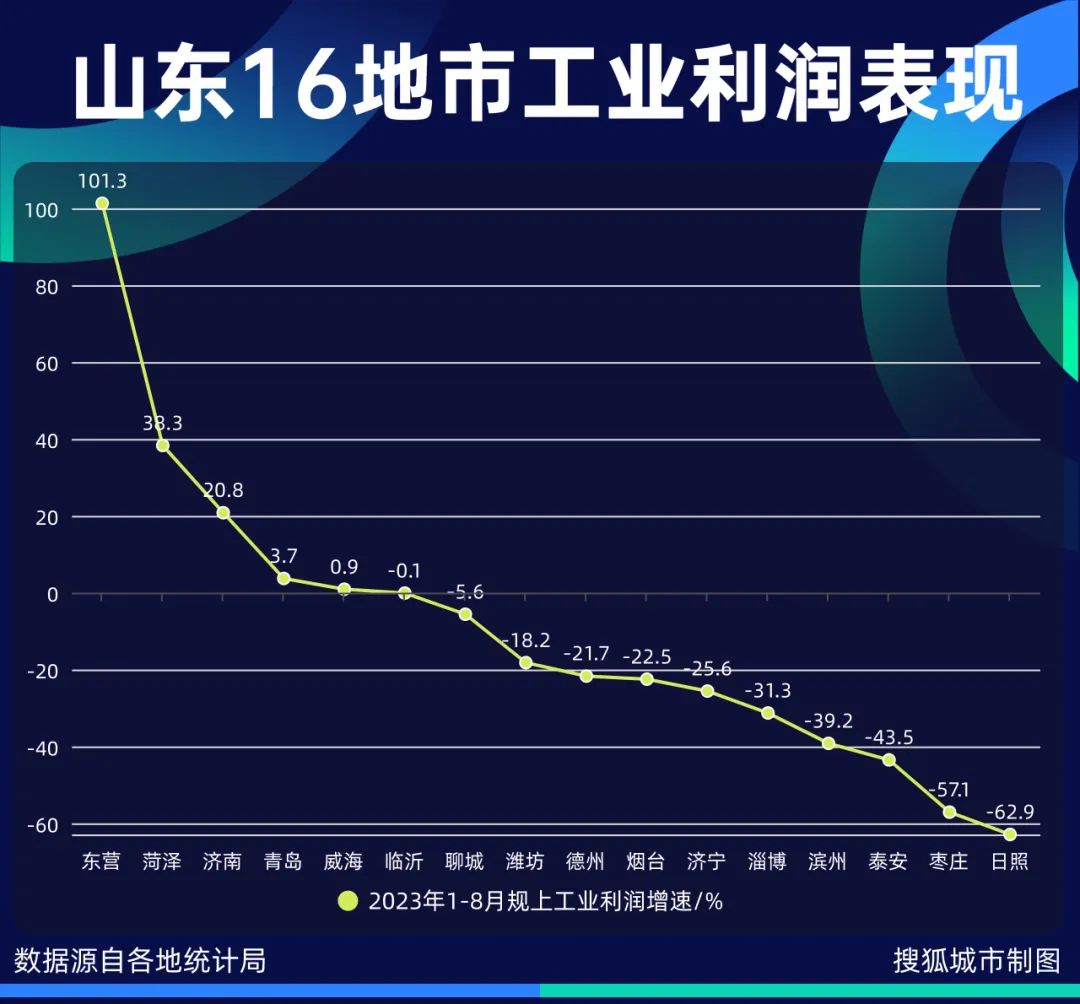 在地市层面,1-8月,除东营、菏泽、济南、青岛、威海5市规上工业利润实现增长外,其余11地市均处跌势。