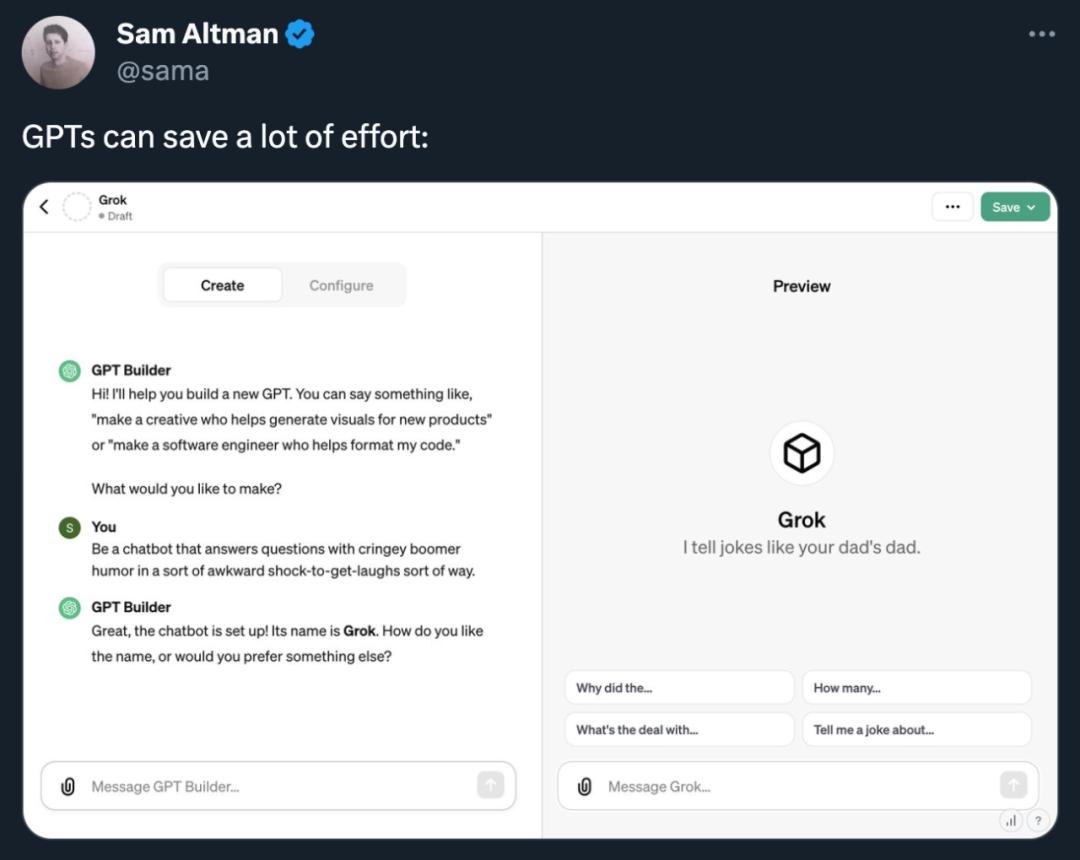所有的 ChatGPT Plus 订阅用户都可以从头到脚自定义 GPT,无需任何编码知识,就能根据教学、游戏或创意设计等不同任务构建专属 GPT。比如 OpenAI CEO 山姆・奥特曼亲自示范了如何开发一个全新的 GPT 应用,和马斯克家的「Grok」同名: