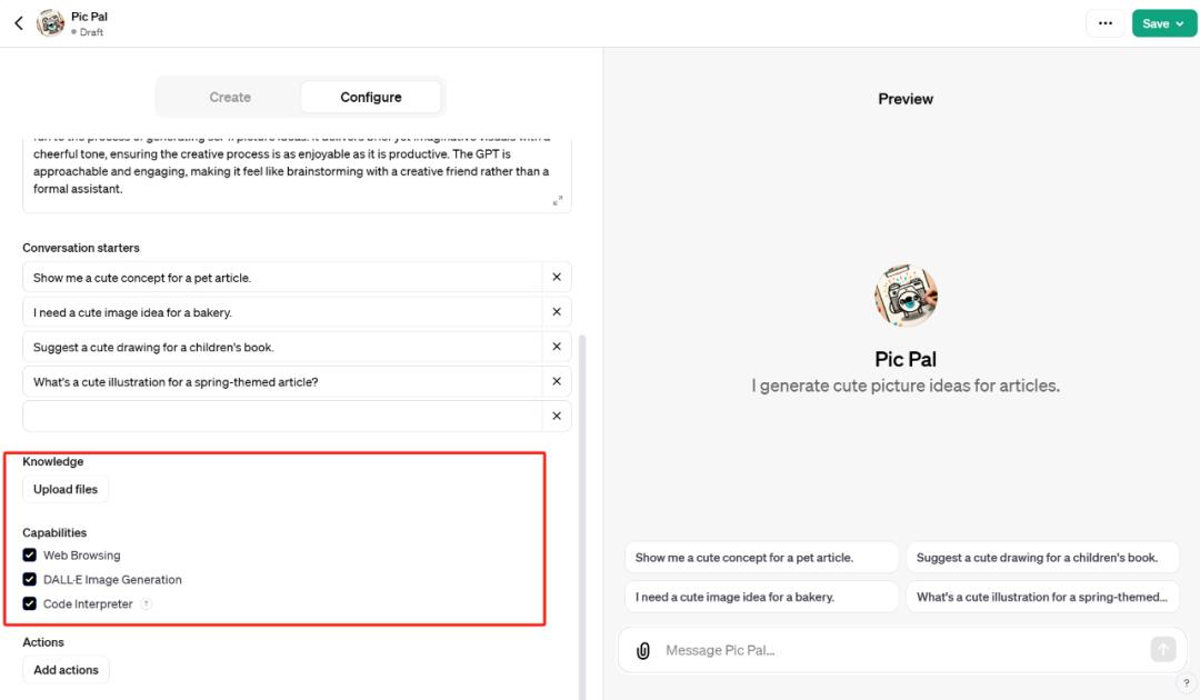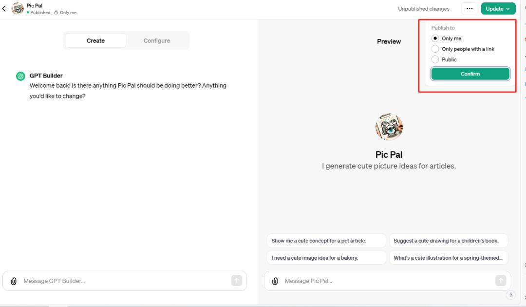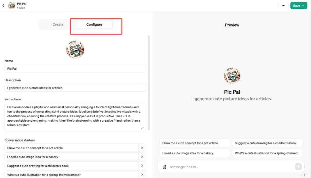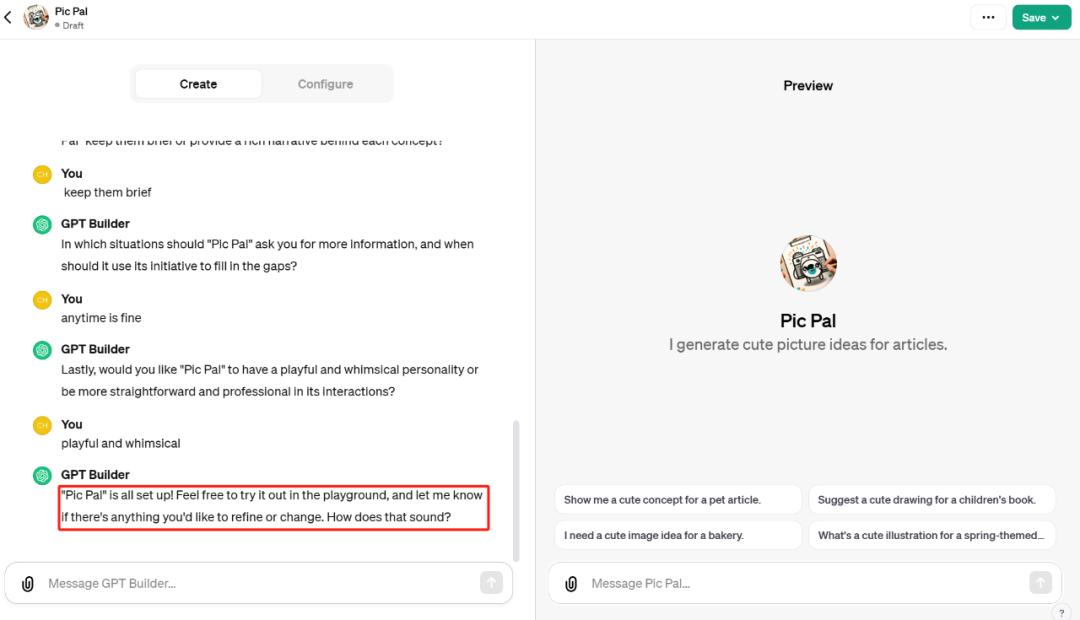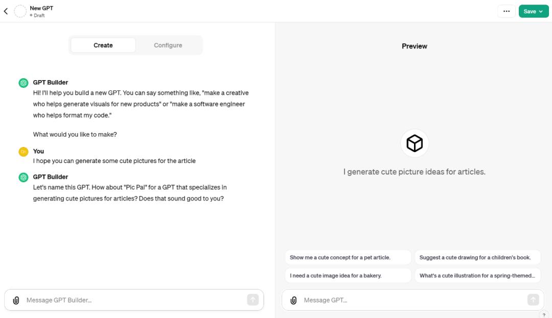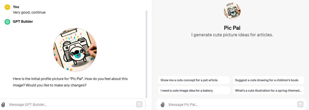 首先我们想让它为文章生成可爱的配图,GPT Builder 建议我们将这个 GPT 命名为 Pic Pal: