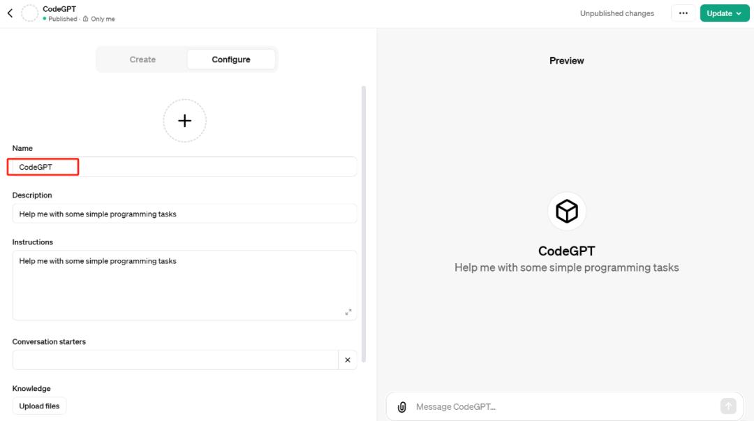 之后,我们又创建了一个名为 CodeGPT 的专属 GPT,希望这个 GPT 能帮助我们完成简单的编程任务,这次,我们直接从「Configure」配置相关信息: