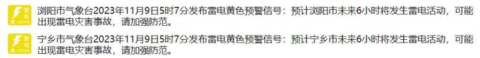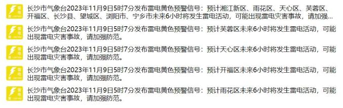 今早长沙气象预警连发18条最新预警信息:长沙市气象台2023年11月9日6时36分发布冰雹橙色预警信号:预计湘江新区、雨花区、天心区、芙蓉区、开福区、长沙县、望城区、宁乡市未来2小时可能出现冰雹,致灾性高,请加强防范。