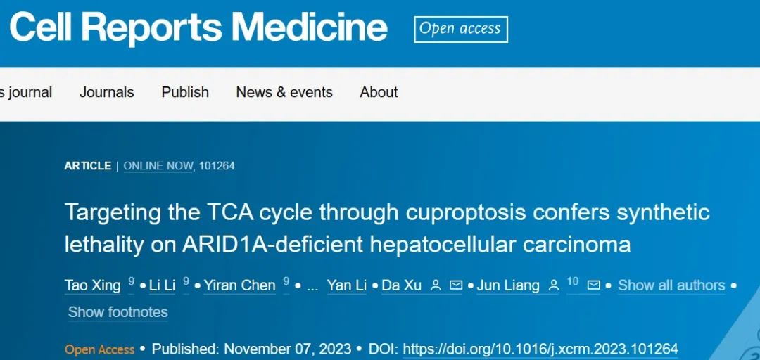 11月7日,北京大学肿瘤医院梁军教授和徐达教授共同通讯在《Cell Reports Medicine》上发表题为“Targeting the TCA cycle through cuproptosis confers synthetic lethality on ARID1A-deficient hepatocellular carcinoma”的论文,研究结果提供了ARID1A缺陷与线粒体呼吸损伤之间合成致死性的证据,表明铜治疗是选择性靶向ARID1A缺陷HCC的有前途的治疗策略。