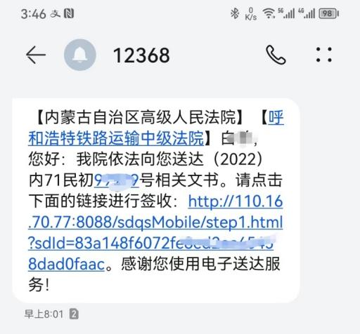 收到电子送达的短信链接后,我害怕是诈骗短信,不敢点开又怕错过法院的信息怎么办?人民法院发送的短信号码一般为“12368”,短信内容中会包含审理法院和案号等信息。如果不敢轻易点击短信内的链接,可以拨打全区法院诉讼服务电话“12368”联系相关法院确认案件信息;
