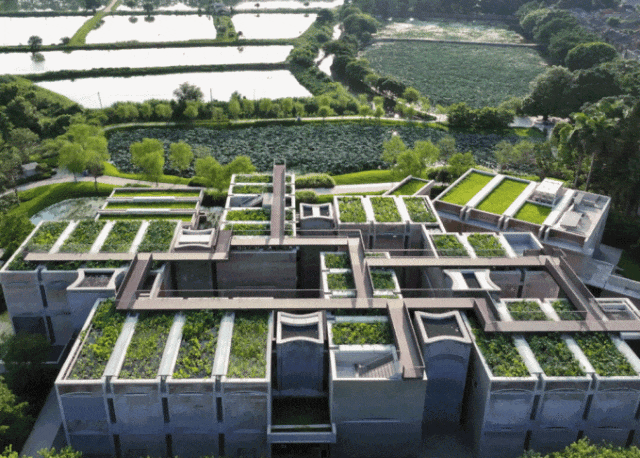 土地、植物和水的关系,其实是很具有南方性的。你到了屋顶上,去步道上走一走,就明白为什么这房子屋顶有池塘,在地上的池塘之上,远远地就看到村落了,这就是乡村之美。