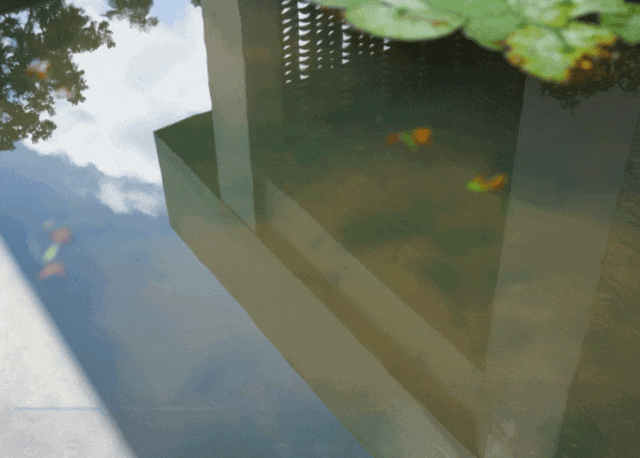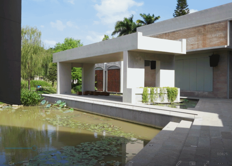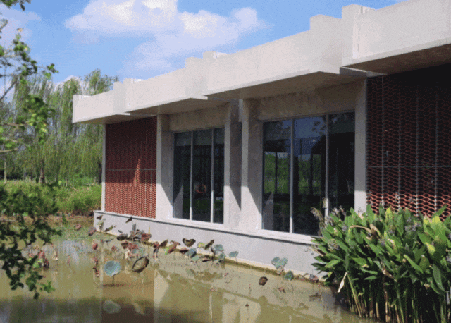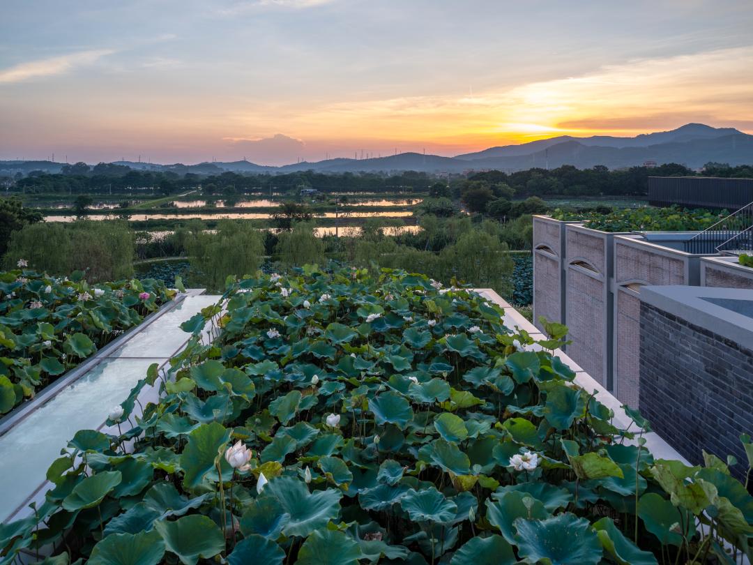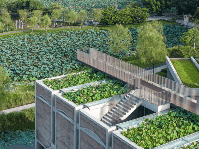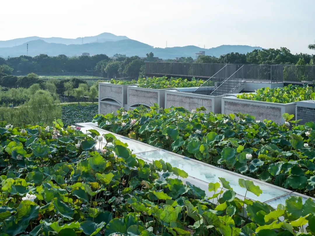 建筑中的荷花种植池与地面上的天然荷花池融为一体,创造了一个“立体荷塘系统”。微风吹过,有“风蒲猎猎小池塘,过雨荷花满院香”的韵味。