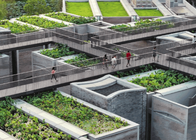 ▲屋顶上放置了近30组池塘,种植水生植物