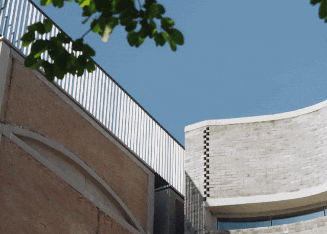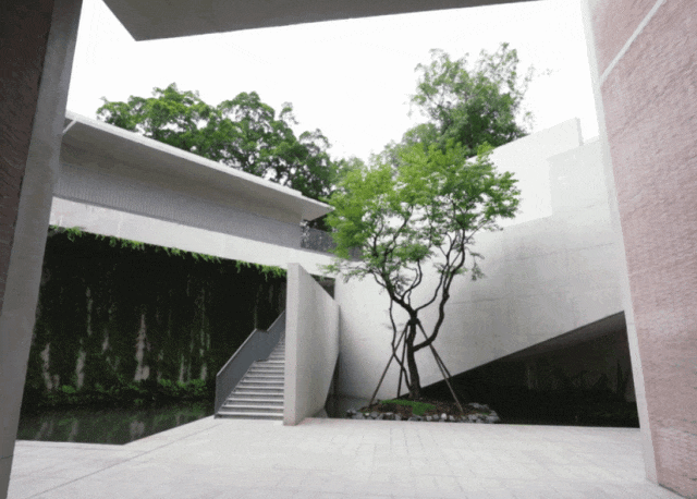 站在下沉庭院这儿,可以看到三种不同的外墙材料,用传统的红瓦镶嵌在墙的表面,转过去是传统的青砖,又是红瓦墙,然后又变成混凝土。