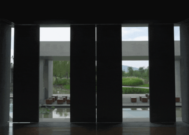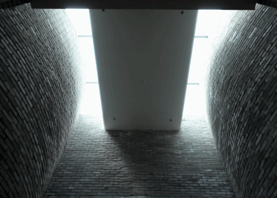 形态上做了曲面“双凹墙”,人在中间有一种挤过去的感觉,每进一个新的空间,光线先暗下来,然后豁然开朗,等于是一收一放一收一放,就这么个逻辑。