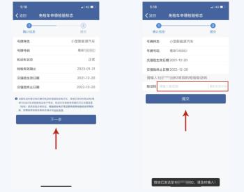 核实车辆相关信息,确认无误后点击进入下一步,通过绑定手机获取验证码,输入验证码并提交申请,即可获得检验标志电子凭证。