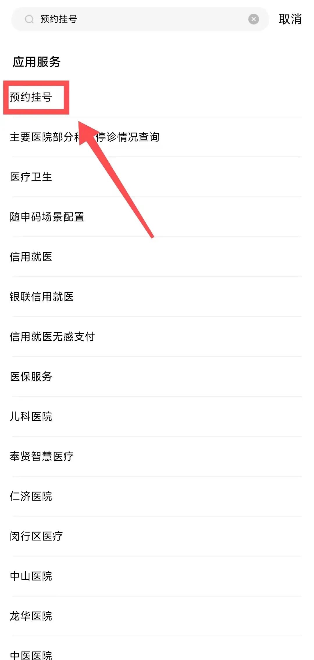 第一步:打开“随申办”APP、“随申办”微信小程序或“随申办”支付宝小程序,搜索进入【预约挂号】服务。