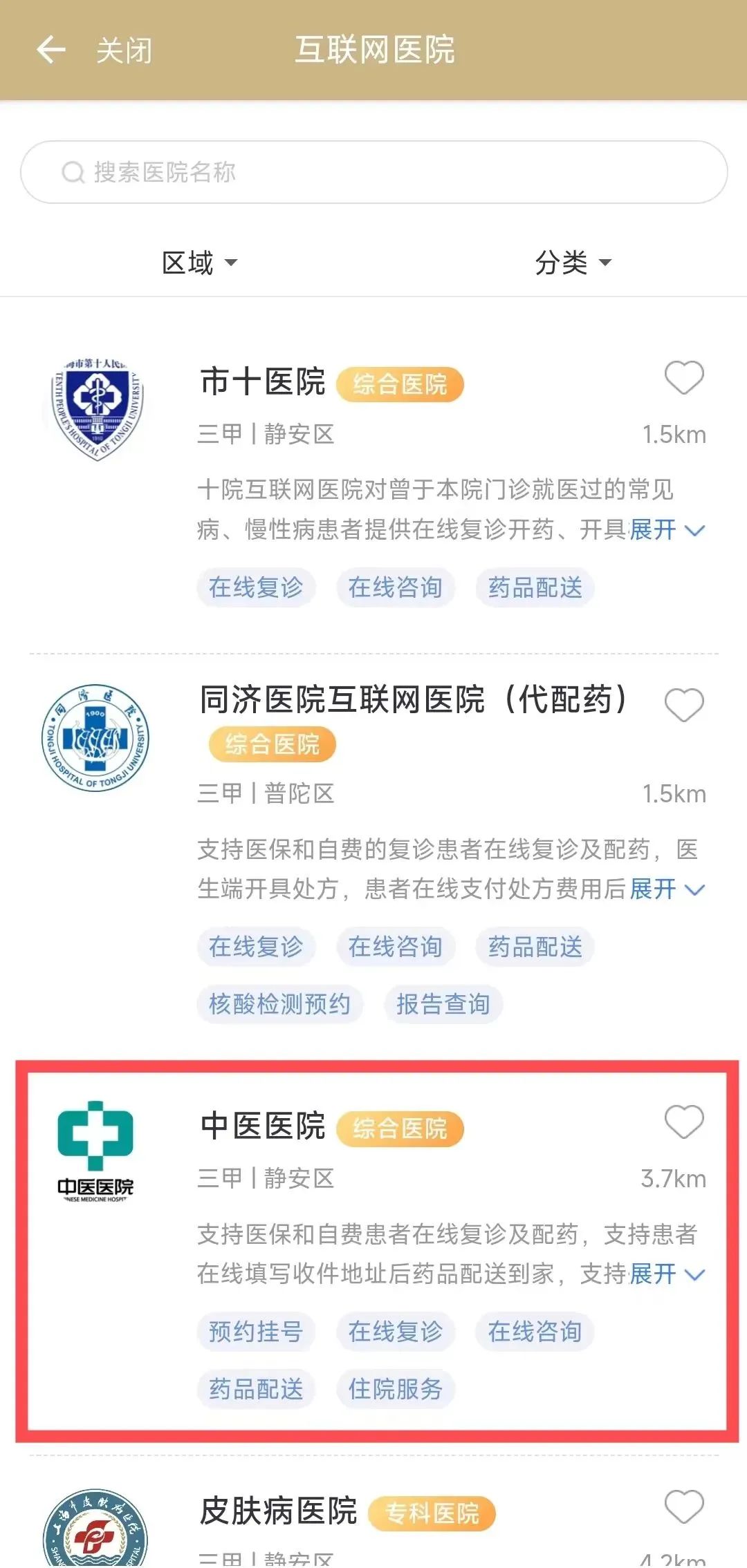 第二步:搜索想去的医院,也可按条件进行筛选,随后点击进入医院服务页面,选择对应的复诊服务(以上海中医医院在线复诊为例)。