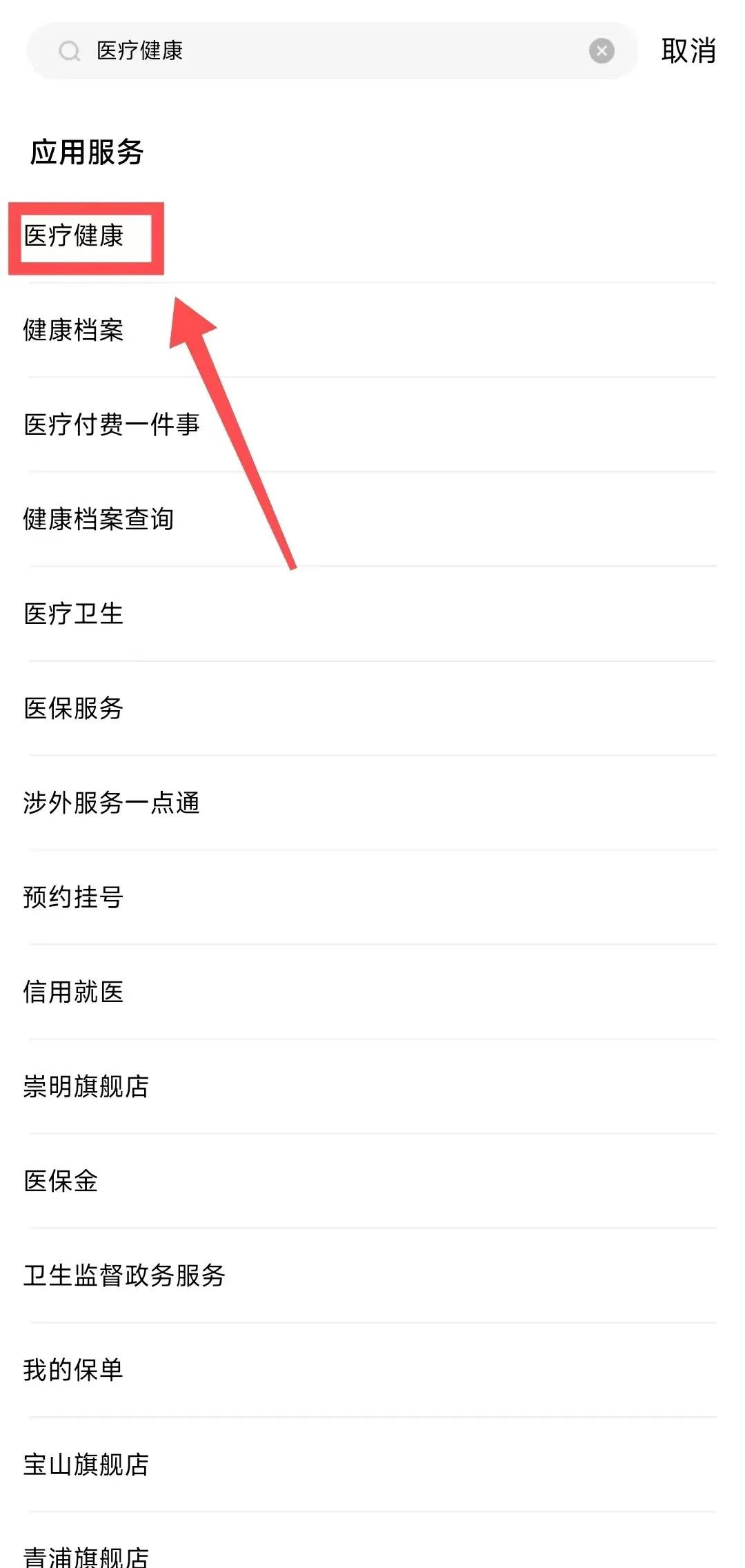 打开“随申办”APP、“随申办”微信小程序或“随申办”支付宝小程序,搜索进入【医疗健康】服务。