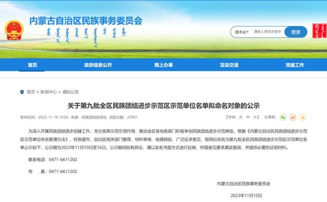 关于第九批全区民族团结进步示范区示范单位名单拟命名对象的公示为深入开展民族团结进步创建工作,充分发挥示范引领作用,推动全区各地各部门积极争创民族团结进步示范典型。根据《内蒙古自治区民族团结进步示范区示范单位命名管理办法》,经各盟市、自治区相关部门推荐、材料审核、抽查核验、广泛征求意见,现将拟命名为第九批全区民族团结进步示范区示范单位名单公示如下,公示期为2023年11月10日至16日。公示期间如有异议,请以实名书面方式进行反映,所提意见要求真实客观,并提供必要的证明材料。