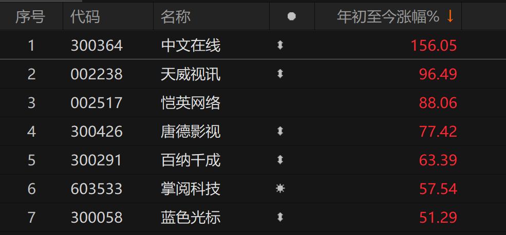 据Choice数据显示,拉长时间来看,短剧游戏互动板块中,拥有微短剧平台ReelShort的中文在线、持有河马剧场(短剧)母公司中广电传媒26%股权的天威视讯、主营网络游戏开发及运营的恺英网络股价年初迄今涨幅位列前三,涨幅分别为156.05%、96.49%、88.06%。唐德影视、百纳千成、掌阅科技、蓝色光标涨幅均超五成。