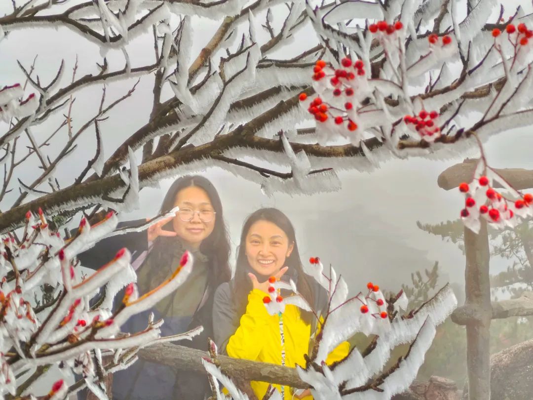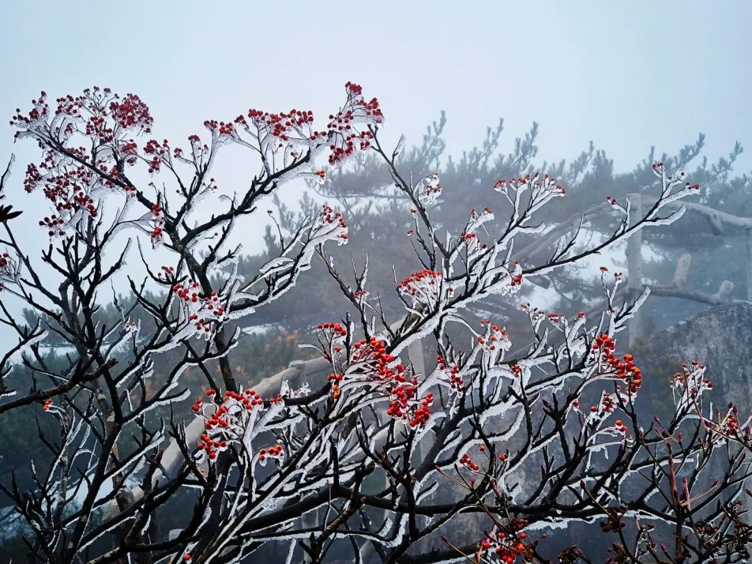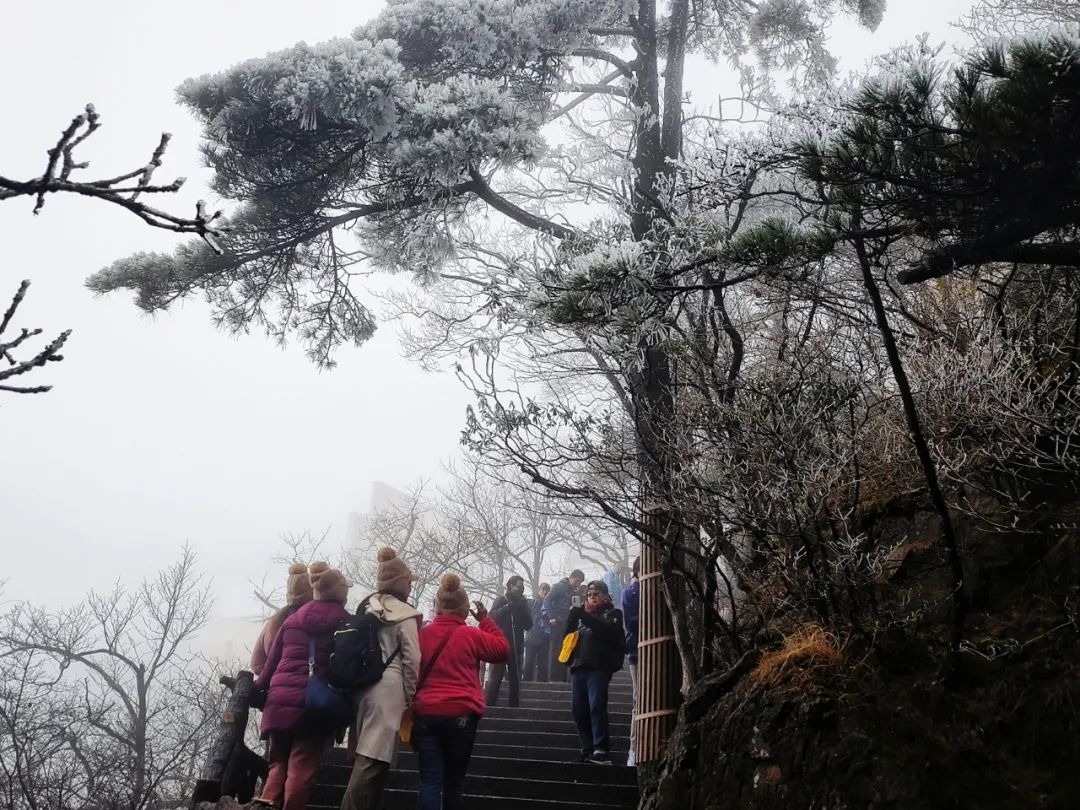 据景区气象部门预测,明天白天多云到晴,偏北风4到5级,气温-5到4℃,可见雾凇景观。请广大来山游客登山赏景时注意防寒保暖。