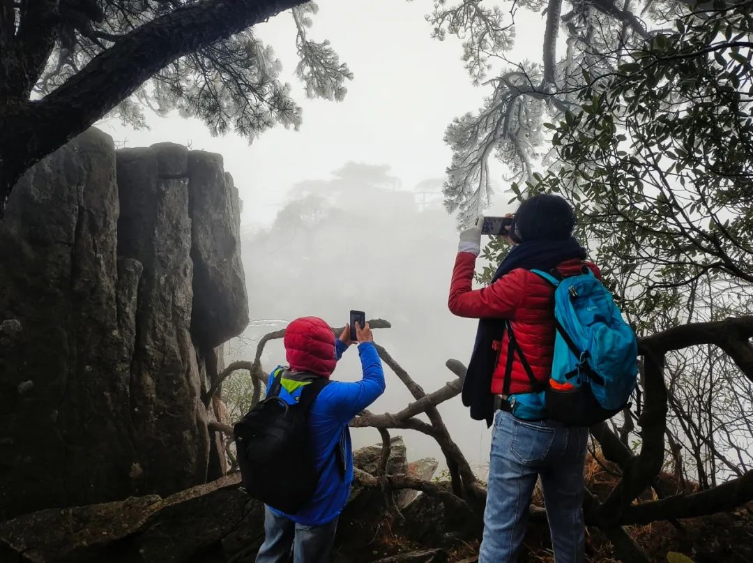 解传光 摄在始信峰、光明顶等景点附近,造型奇特的松、遍地的灌木,都成为银花盛开的玉树,仿佛冰塑。山峦、怪石之上,茫茫一片,似雪非雪,仿佛披上一层晶莹的玉衣,光彩照人。游人穿行在雾凇林间,好似迈进了琉璃之境,让人如痴如醉。远远望去,绣上朵朵洁白的针叶,恍惚间让人分不清是叶还是花。萦绕在山间的云雾也给此刻的山巅增添了神秘的韵味。