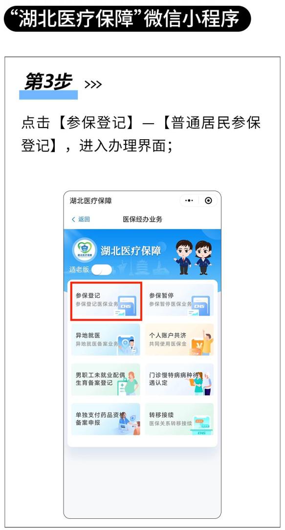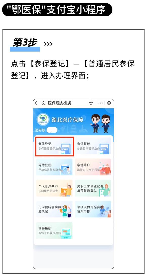 可通过鄂汇办APP、“湖北医疗保障”微信小程序、“鄂医保”支付宝小程序和湖北省政务服务网等线上渠道进行参保登记,也可凭身份证在县(市 区)、乡镇(街道)、或村(社区)政务服务窗口现场办理。