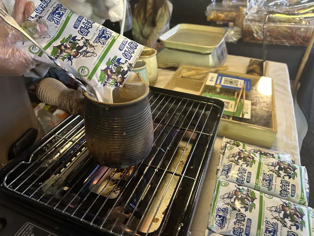 “罐罐烤奶”的操作方式十分简单,摊位上摆放一个桌面型的烧烤架,上面放上6个造型古朴的瓦罐,随着瓦罐的温度抬升,将茶叶、糯米放进去炒出焦香,再倒入牛奶温热,加入冰糖加热融化,最后撒上玫瑰花、枸杞、红枣等一类食材作为点缀,就可以倒入杯中带走饮用。