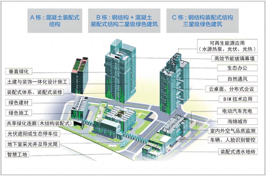 装配式建筑示范:A栋采用混凝土结构装配式,B栋采用钢混结构装配式,C栋采用钢结构装配式,实现装配式体系综合应用,各栋建筑装配率均大于75%;项目按湖南省绿色装配式建筑评价标准,均达到AA级绿色装配式建筑要求,是湖南地区装配式结构体系综合应用典范。