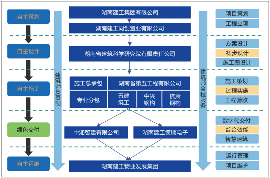 湖南省建科院和湖南省五公司联合成立项目部,能够发挥建科院产业链上游的优势,对项目立项的“初心”把握更准确,对建设工程全生命周期的建设目标更能把控“一惯性”,从设计引领的高度控制建筑的品质,还能够调动湖南省五公司总承包的精细化施工、工法创新、优化管理管控资源。