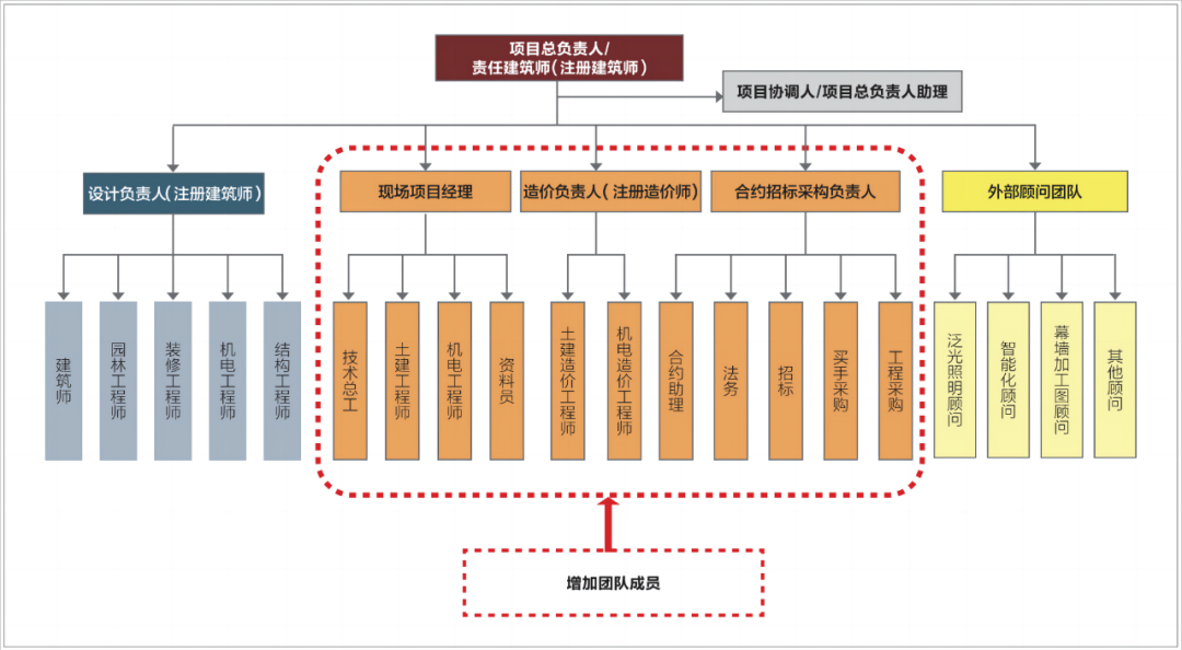 传统设计院的五大专业在建筑师负责制的要求下,需增加负责现场的项目经理团队、负责造价咨询的团队和负责招标合约采购的团队,这些团队在责任建筑师的领导下为项目服务,同时也是建筑师团队中的骨干成员。