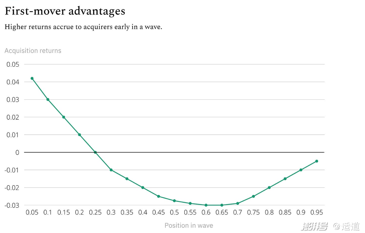 通过研究20年期间的3194笔并购,研究人员发现了一种有趣的关系:在浪潮早期采取行动的买家更容易成功。