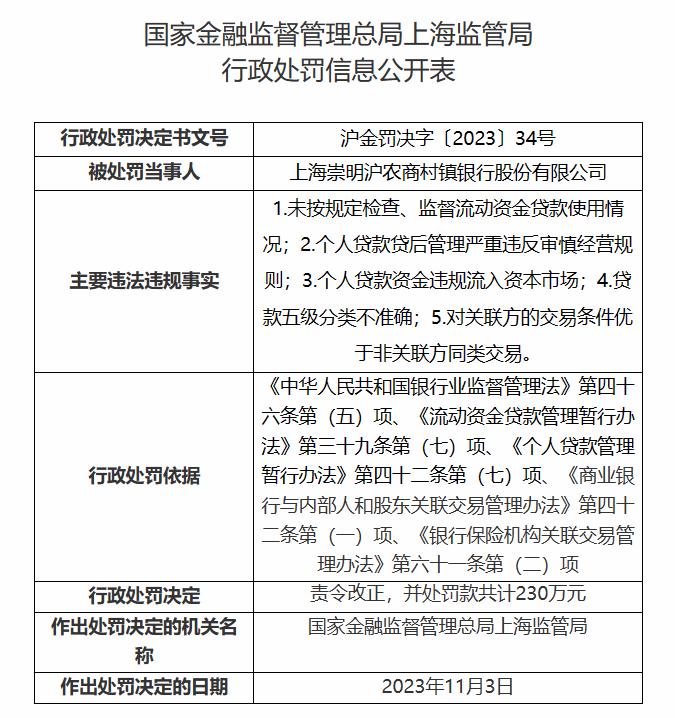 罚单显示,上海崇明沪农商村镇银行因个人贷款资金违规流入资本市场;贷款五级分类不准确等5项违法违规行为被责令改正,并处罚款共计230万元。