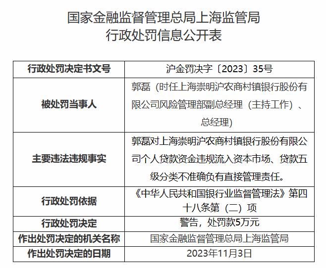 11月13日,上海农商行旗下一家村镇银行收到来自国家金融监督管理局的罚单。
