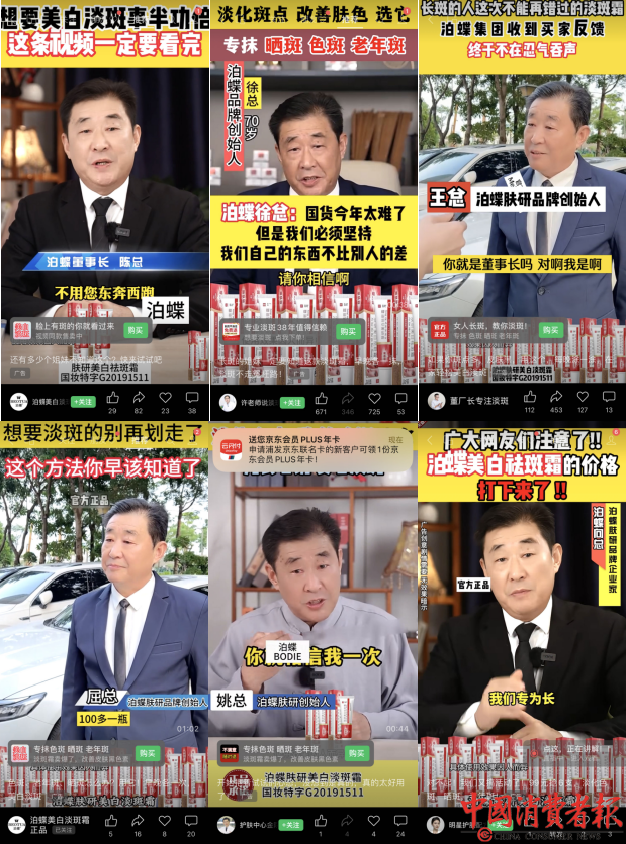 此外,11月13日《中国消费者报》记者发现“泊蝶肤研美白祛斑霜”广告代言人换了,但都标称为“董事长”。
