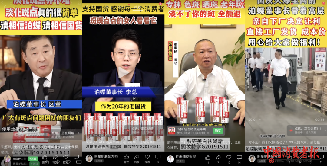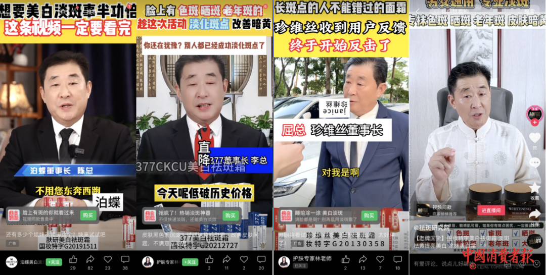 在账号名为“许老师说淡斑”的视频广告中,又新冒出一个中年的泊蝶董事长,标称“泊蝶祛斑霜董事长黄总”,这样算下来,“泊蝶肤研美白祛斑霜”至少已有4个长相不同、姓氏不同的董事长。