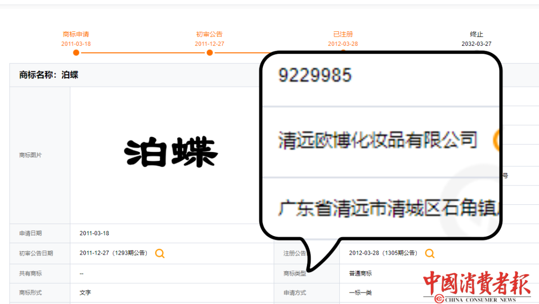 据国家企业信用信息公示系统显示,这家公司执行董事、经理、监事分别为夏某花、曾某春、刘某锋,查看股权,夏某花占股80%,是“大股东、实际控制人、最终受益人”,监事刘某锋占股20%,曾某春不占股,但却是法定代表人、公司经理。上述3人姓氏与视频广告代言人中标称的“董事长”姓氏均不相符合。而查询广州市爱莲化妆品有限公司发现,该公司名下并未注册“泊蝶”商标,目前日化用品类“泊蝶”商标所有权人是清远欧博化妆品有限公司。