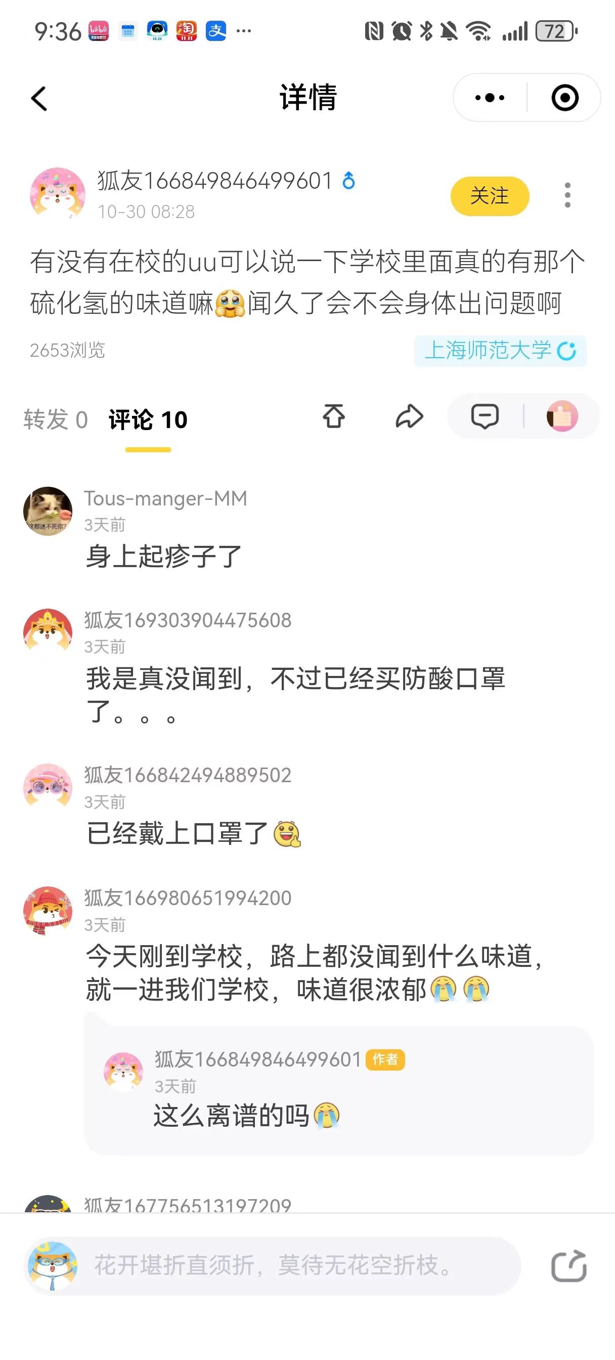 从地图上看,泵站周边还有一所挨着佳源新都小区三期的海贝幼儿园。泵站南侧直线距离1公里左右是上海应用技术大学奉贤校区,直线距离2公里左右是上海师范大学奉贤校区。校内学生也曾表示闻到强烈臭味,尤其是10月28日前后,上海师范大学校内线上交流社区进行了相关讨论,有学生表示“好臭”“咳嗽不断”“喉咙疼到不行”。