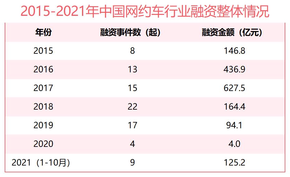 公开数据显示,2018年我国网约车行业融资金额达到顶峰,当年发生融资事件共15起,融资金额共627.5亿元。2018年后行业遇冷,虽然融资数量有所增长,但融资金额却呈现“断崖式”下跌。2021年头10个月,网约车行业总融资额只有125.2亿元。