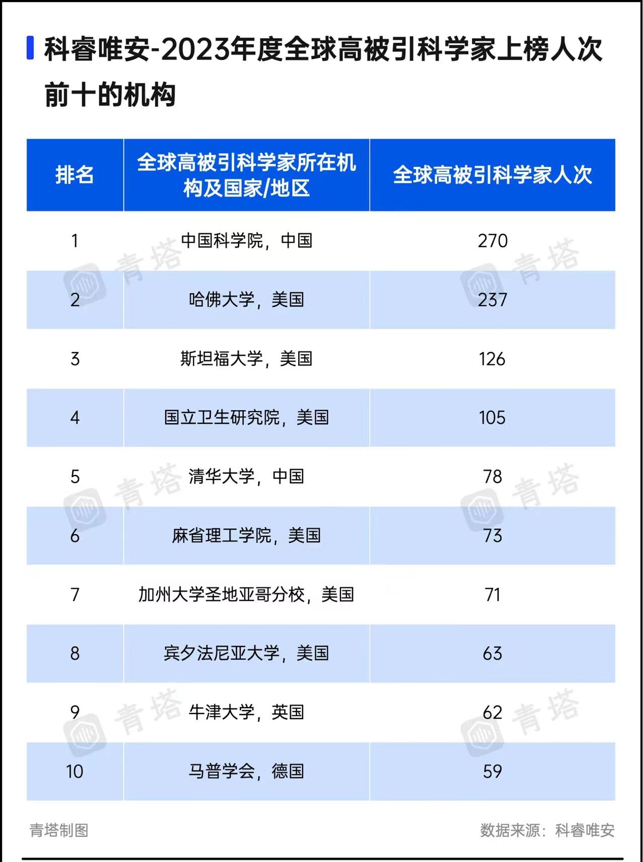 中国科学院共有270人次上榜,多于去年的228人次,成为拥有全球高被引科学家人次数最多的机构。清华大学位列全球机构第5位,与2022年持平。