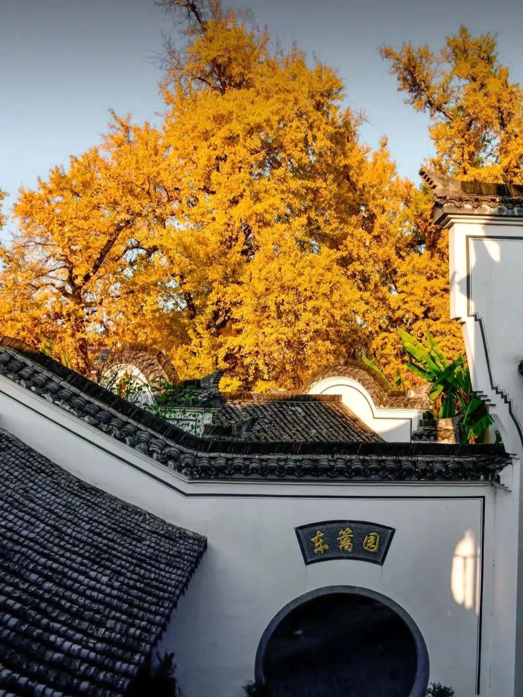 看银杏飞舞在青瓦白墙