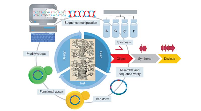 科学家会先使用计算机软件辅助设计要合成的DNA构建。设计的DNA将被分为1–1.5kb的可合成片段(synthons)。合成片段可以通过单链寡核苷酸进行组装拼接合成,组装成更大的DNA元件。组装好的DNA需要进行两步验证:序列验证和将其转化到细胞后的功能验证。根据验证结果,进行修改,重复测试循环,直到获得所需要功能的DNA构建体[3]。