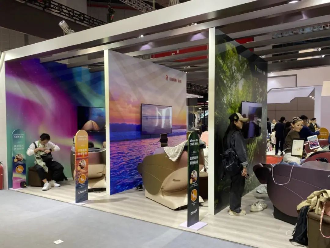 据傲胜展台人员介绍,“养身椅系列”定位高端,价格在4万元到6万元不等。结合“AI压力监测”技术,通过生物传感器监测压力指数、OSIM Well-Being APP长期追踪压力值趋势,傲胜的养身椅系列可以精准了解每一位使用者,从而定制专属的养身程序。全新上线的“创新场景转移科技”,用户只需轻轻一按,就能身处“落日海滩”、“星夜极光”、“悠然森林”三种不同的养身场景。