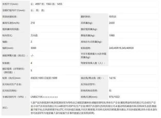 车身方面,两款小米汽车长、宽、轴距分别为4997mm、1963mm、3000mm,高度有所不同,分别为1440mm、1455mm。此外,两款小米汽车车前均有“小米”标志。在车尾,两款车均显示尾标“北京小米”。