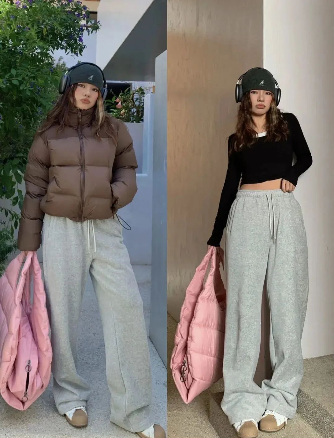 运动裤一直是时尚潮流中的热门单品,冬天的外套基本都能搭,大衣、羽绒服、棉服、毛绒外套等等。